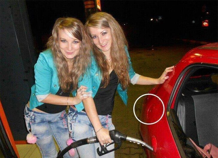 We can’t decide if it’s funnier that it’s taking the two gals to fill the gas tank or that the nozzle points in the wrong direction. Filling up a car’s gas tank shouldn’t require two persons, much less a pair of identical twins. Let’s keep our fingers crossed and hope the gas handle doesn’t get turned.