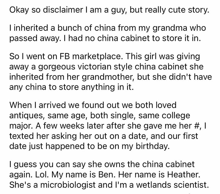 We met up to see the cabinet, and I was immediately smitten with Heather. We talked for hours, and I knew I had met someone special. Our first date fell on my birthday, which was a delightful twist of fate. Now, the china cabinet is back in Heather’s home, housing my china sets.